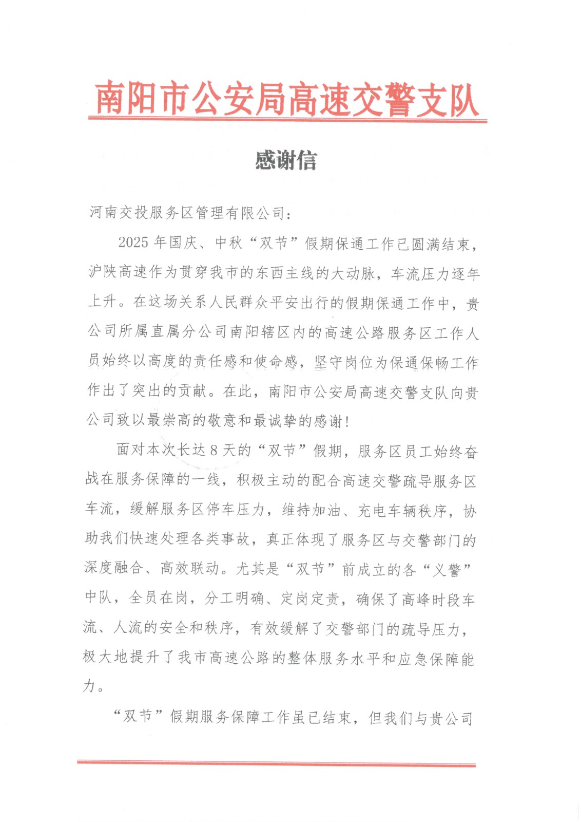 《一天內(nèi)連收兩封感謝信…》 “雙節(jié)”期間,面對(duì)假期車流人流驟增,公司所屬服務(wù)區(qū)科學(xué)部署、積極應(yīng)對(duì),圓滿完成安全…